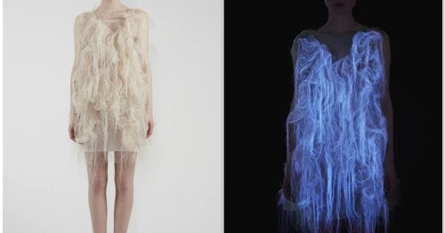 Очевидное-невероятное – изобретено платье, оживающее, когда на него смотрят! Йинг Гао придумал наряд, снабженный специальными сенсорами, распознающими человеческий взгляд – затейливые складки и бахрома начинают причудливо вздрагивать и колыхаться. А в темноте они еще и светятся – просто чудеса!