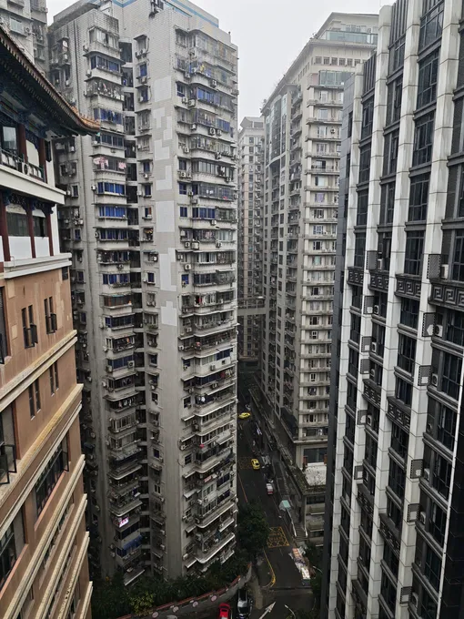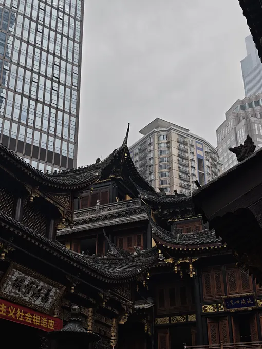 Чунцин — вертикальный мегаполис. Из-за особенностей ландшафта город действительно строили в высоту. Именно поэтому, гуляя по площади, вы, например, с удивлением обнаружите себя на 22-м этаже: если выглянуть за перила, можно увидеть, как далеко внизу течет жизнь. Последний день в городе мы посвятили как раз посещению таких локаций с «вау-эффектом». Помимо самой площади, еще один мой фаворит — храм Луохань. Это историческая локация, куда буддисты действительно приходят молиться. Но, если поднять голову, гуляя по двору храма, можно увидеть огромные здания, которые находятся прямо по соседству.