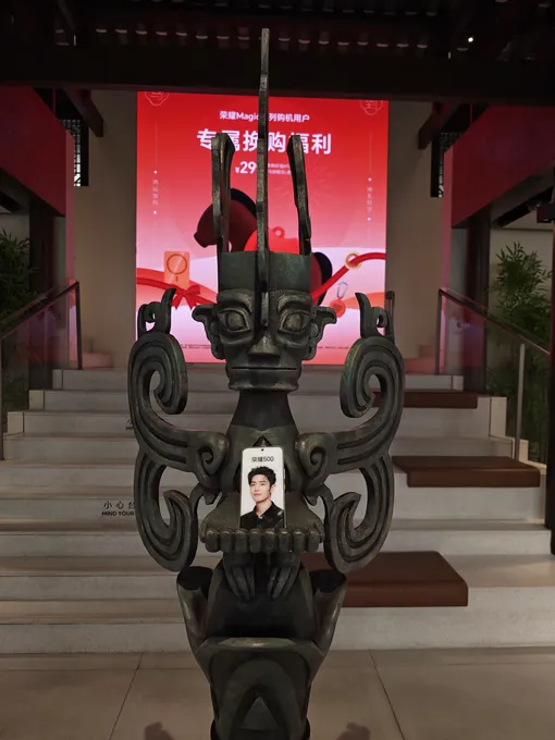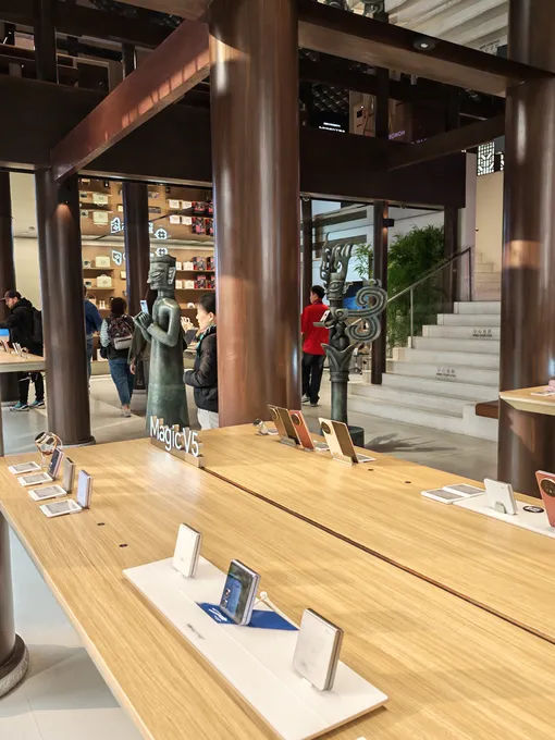 Вообще-то бренд смартфонов позвал меня не просто так: главной задачей в путешествии был тест камеры их нового смартфона HONOR Magic 8 Pro. Поэтому сразу по прилете в Чэнду я начала ловить кадры. Важно понимать, что это город на юге страны, в котором жизнь течет достаточно размеренно. По пути от аэропорта до первой локации я замечала, как в разгар рабочего дня сотрудники магазинчиков и кофеен играют перед входом в бадминтон или просто греются на солнце. Неосознанно наша группа прониклась размеренным настроем и добралась до первой точки только к вечеру. Мы оказались в историческом квартале Kuanzhai Alley. Первое яркое впечатление — флагманский магазин бренда гаджетов. Современные технологии здесь соседствуют с традиционной китайской архитектурой: например, фигурка Popmart, разработанная для бренда, прячется в дворике между черепичными крышами.