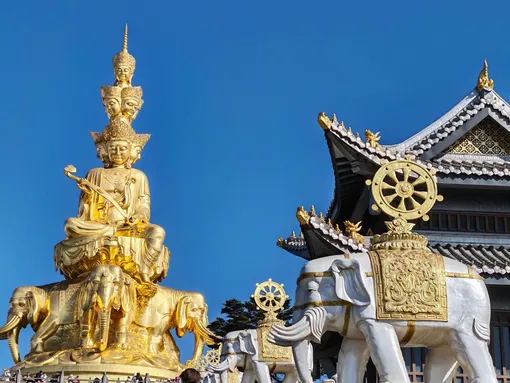 Одна из основных религий в Китае — буддизм, и не уделить достаточного внимания изучению традиций и философии было бы странно. Поэтому второй день мы начали с длинной пятичасовой дороги, чтобы добраться до горы Эймешань. Это одна из главных точек паломничества буддистов. Кстати, интересно, что в Китае подобные локации — не типичное туристическое направление, поэтому местные жители не всегда понимают желание иностранцев взобраться на гору, чтобы увидеть огромную статую Будды.