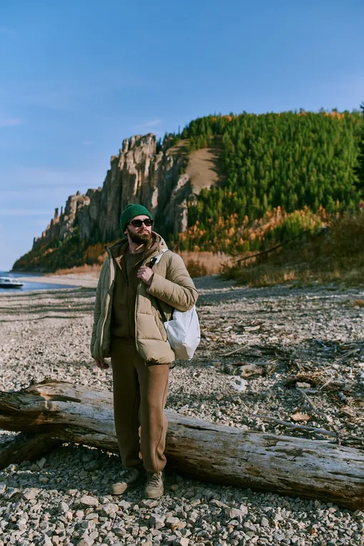 Небольшой совет: закладывайте на поездку пару дней (на берегу есть прекрасная база отдыха, где можно остановиться) и собирайте многослойные образы: на воде довольно холодно, а вот во время хайкинга хочется снять куртку и подниматься налегке. Мне в этом помог спортивный костюм из капсулы Weekend: комфортная и стильная модель из двухслойного футера c якутским мотивом идеально подошла для активного отдыха в холодное время года.
