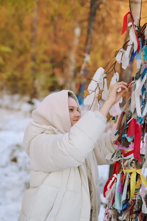 У якутов, на мой взгляд, есть потрясающая традиция: они завязывают ленточки на деревьях перед дорогой как знак уважения к природным духам с просьбами о удаче и защите в пути. В преддверии 5-часовой поездки до Ленских столбов, мы, конечно же, решили последовать этой традиции — потом в пути я еще несколько раз видела такие деревья.