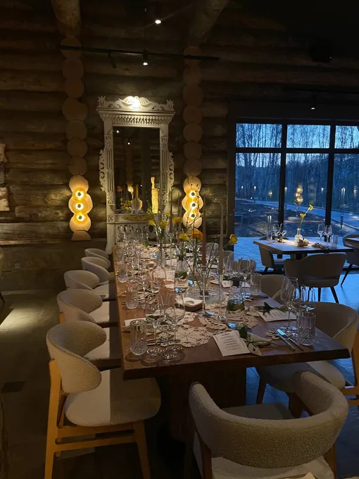 В главном здании отеля находится ресторан авторской современной русской кухни SheLESt. Здесь можно расположиться как в зале, так и на веранде с видом на реку и лес, чтобы попробовать блюда из локальных продуктов, приготовленные в настоящей русской дровяной печи. К слову, бренд-шеф Антон Крупинин не только поддерживает местных производителей, но и использует продукты из собственной теплицы, а также включает в меню дары леса — черемшу, грибы, ягоды, еловые шишки и цветы. Во время обеда я попробовала: