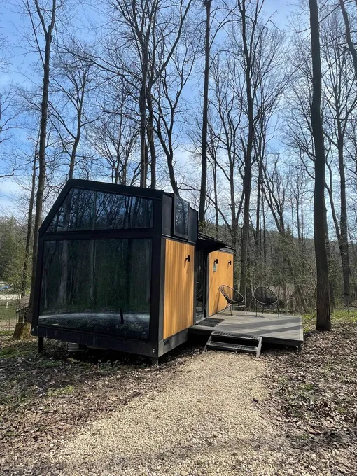 И это еще не все: в доме есть второй ярус с панорамным окном на крыше. Под ним — еще одно спальное место, лежа на котором можно наблюдать за звездным небом. На территории также есть решения для больших компаний или семей — коттеджи-дуплексы, массивные срубы и гостевые дома.