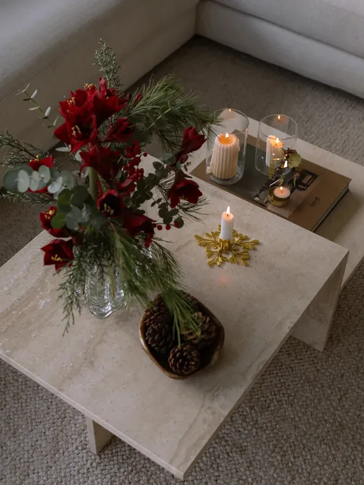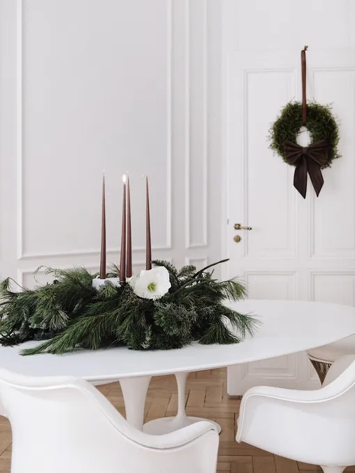 Не пытайтесь при этом декорировать каждый сантиметр: пусть ваш дом живет и дышит — например, за счет одной крупной композиции в центре комнаты и нескольких небольших акцентов. А если вы нежно любите классику, то пусть она остается в пространстве в виде деталей: так, на новогоднем столе можно расставить свечи в простых подсвечниках, обернуть основания белыми гирляндами или тонкими лентами, а рядом положить веточки хвои — такой минималистичный подход будет выглядеть элегантно и не перегрузит интерьер.