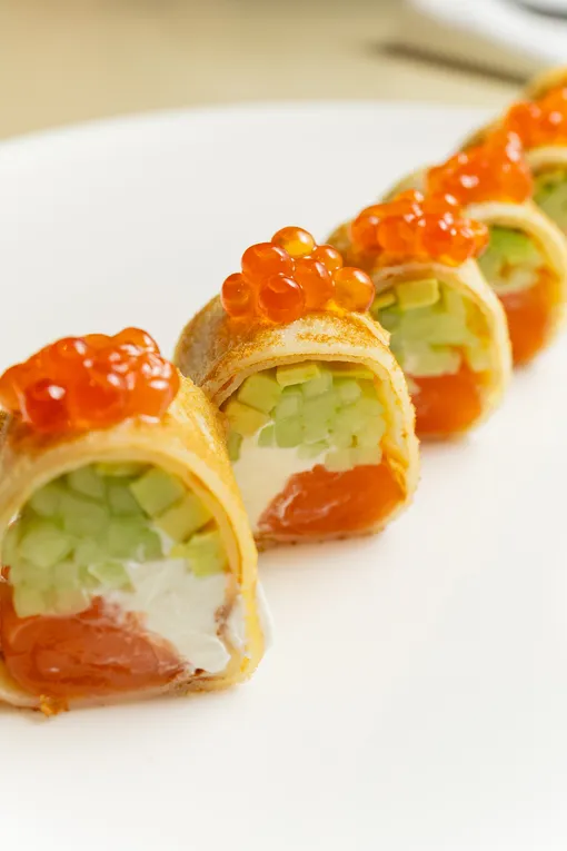 В Cutfish заказываем вариации блинов на азиатский манер. Например, среди спешлов — блинный ролл с лососем и икрой или камчатским крабом, блины с томленой щекой и соусом васаби. И блинный торт матча — на десерт.