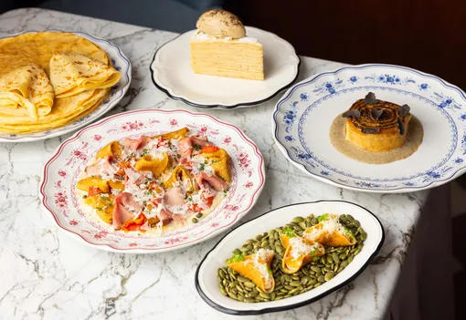 Легендарный проект, который недавно переехал с Патриков на Цветной, отмечает Масленицу по-итальянски. Здесь блины скрестили с традиционной закуской вителло тоннато и подают с каперсами и таджасскими оливками. Их же превратили в элегантный рулет с белыми грибами, сметаной и лепестками трюфеля. Даже чипсы приготовили из блинов — они стали основой для закуски с рийетом из тунца и щучьей икрой. А на сладкое шеф-кондитер Фатима Салех приглашает попробовать блинный торт, вдохновленный вкусом миндального круассана.