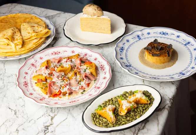 За уже ставшими классикой сочетаниями отправляемся в Remy. Среди сытных вариантов — блины с курицей, говядиной, вариант с лососем, авокадо и сливочным сыром. А для тех, кто хочет попробовать все сладкие вариации в столице, — блинный торт тирамису и блинчики Креп Сюзетт. Из допов к классическим блинам можно выбрать икру, мортаделлу или лосось.