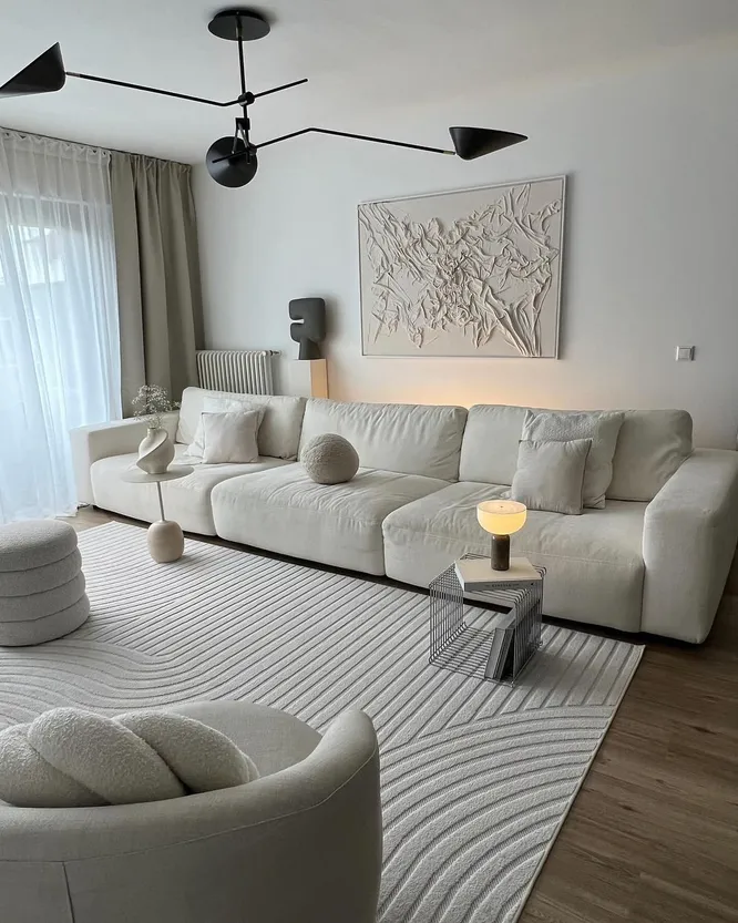 Для интерьеров в стиле минимализм отлично подойдут масштабные панно в светлых тонах с плавными линиями, которые зрительно сделают пространство еще объемнее. Внимание привлекают и абстрактные произведения с вкраплениями золота — с ними помещение станет воздушнее.