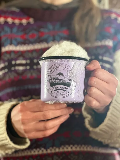 Следующей точкой маршрута стал яркий желтый домик (пристанище для путников), где нас ждали горячий обед и возможность передохнуть, поделиться впечатлениями. После насыщенной прогулки даже обычная вареная картошка с рыбными котлетами кажется самым вкусным блюдом, которое ты пробовал на Камчатке — даже в сравнении со специалитетами из заведений в черте города, где в меню можно встретить морских гребешков, краба, устрицы, мясо дичи и многие другие традиционные деликатесы региона. А уж как здорово было пить горячий чай, который охлаждаешь до приемлемой температуры, добавляя в него чистейший снег.