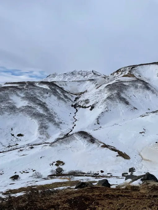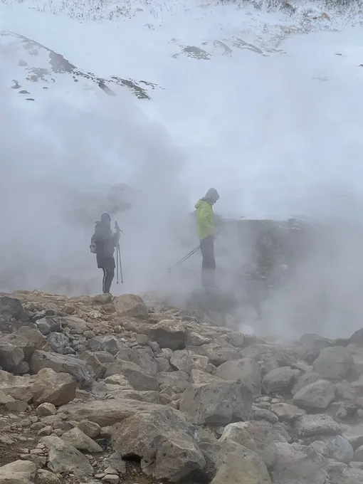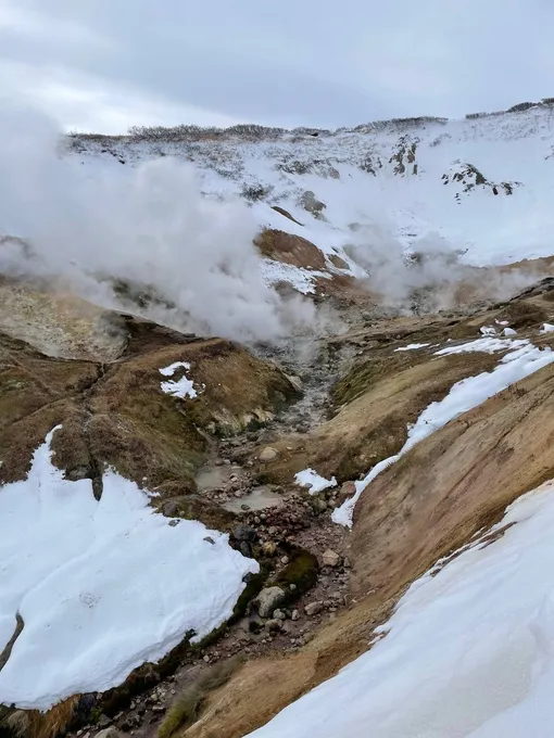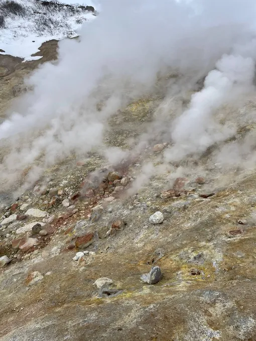 Вторая остановка — Мутновская геотермальная электростанция, от которой можно дойти до Дачных источников. Путь непростой для неподготовленного туриста (в середине октября здесь лежит снег) — помимо продуваемой всеми ветрами местности и снега под ногами вас ждет внушительный спуск и подъем по пути в Долину гейзеров. Так что термобелье, непродуваемая одежда, трекинговые ботинки и палки — ваши лучшие спутники. Но путь того стоит — впервые увидеть подобное природное явление, когда из-под земли выбиваются струи горячего воздуха и протекают ручьи с теплой водой, нагреваемой недрами Земли, — незабываемое впечатление, дарящее воспоминания на всю жизнь. Здесь приятно отдохнуть со стаканчиком чая, любуясь красотой, которая окружает со всех сторон. К слову, к специфическому запаху серы быстро привыкаешь и перестаешь его замечать.
