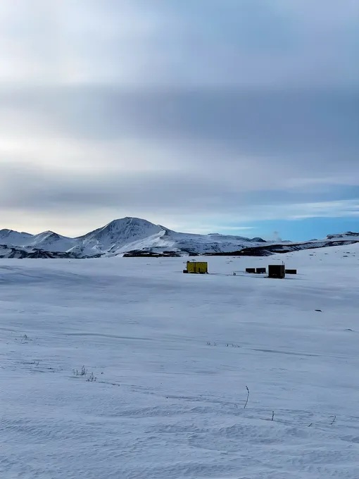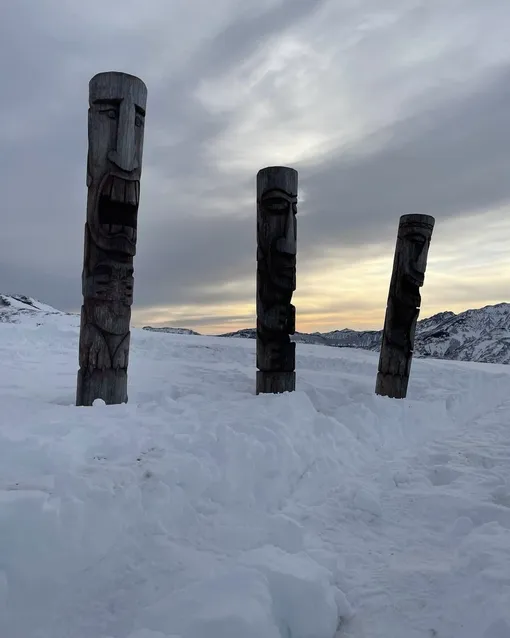 Чтобы ощутить, как бьется подлинное сердце Камчатки, нужно отправиться ближе к вулканам. Мой выбор пал на подножие Мутновского вулкана, где находятся Вилючинский перевал, каньон Опасный и Дачные горячие источники. Мы отправились туда организованной группой на вездеходах. Первая остановка — Вилючинский перевал у установленных там тотемных столбов-гамулов — духов вулканов из ительменских преданий, которые служат для местных жителей и камчадалов — потомков русских переселенцев и коренных народов — оберегами от непогоды. Оттуда открываются бескрайние белоснежные пейзажи и панорамный вид на вулканическое плато района «Мутновки» — на вулканы Мутновский, Горелый и Вилючинский.