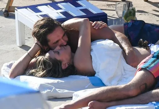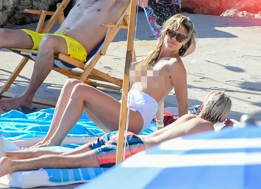 После ресторана Хайди и Том пошли на пляж. Для того, чтобы позагорать и поплескаться в ласковых водах Тирренского моря, молодая жена выбрала белоснежный купальник монокини с экстремально глубоким декольте. В какой-то момент супермодель и вовсе решила позагорать топлесс.