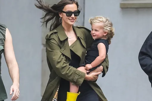 Ирина была одета в зеленое пальто Burberry, чёрное мини-платье и резиновые сапоги Chanel. Ее волосы были распущены, а глаза прятались за солнцезащитными очками. Малышка была одета в одном стиле с мамой. На ней было платье Versace, плащ зеленого цвета и непромокаемая обувь.
