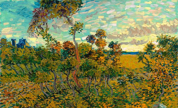 «Новинка» носит название «Закат в Монмажуре» и была написана в 1888 году в Арле – этот период творчества знаменитого постимпрессиониста считается самым плодотворным в его карьере. На полотне изображен местный скалистый пейзаж, виноградники и руины бенедиктинского аббатства.