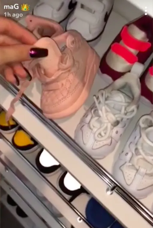 Такая крупная сумма объясняется тем, что Кайли покупает дочке исключительно дизайнерские вещи. В коллекции есть крошечные кроссовки Giuseppe Zanotti за тысячу долларов, ботиночки Gucci за 275 долларов и несколько пар кроссовок Nike Air Force, стоимостью 50 долларов каждая.