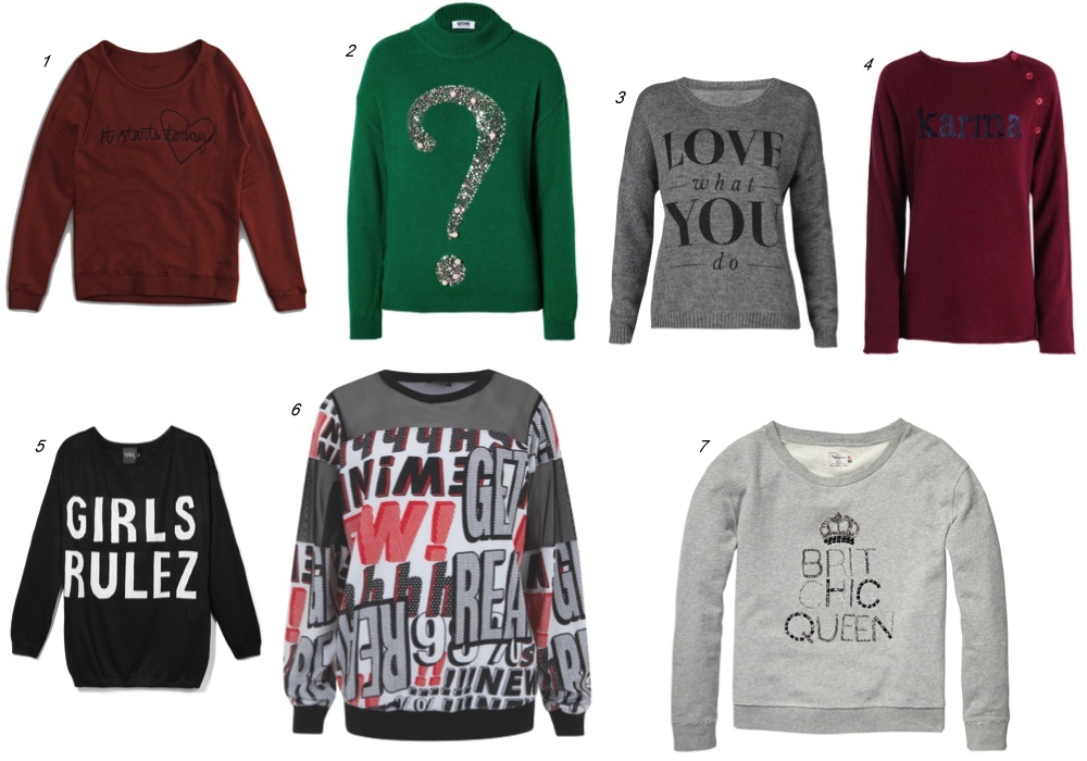 Джемперы с надписями, дающими знать, что у вас на уме, сейчас на пике популярности. И пусть идея таких принтов стара как мир, смотрятся эти «лозунги» всегда эффектно.