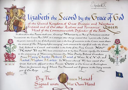 Законодательство о королевских браках гласит о необходимости такого согласия в письменном виде. Почти за неделю до свадьбы Елизавета II, наконец, подписала такой документ. Снимок написанного от руки согласия появился в Instagram (Социальная сеть признана экстремистской и запрещена на территории Российской Федерации) Букингемского дворца.