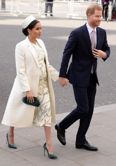 В отличие от Виктории, Меган сделала свой образ более сдержанным. Она дополнила платье длинным пальто молочного цвета и головным убором в тон. Лодочки супруга принца Гарри предпочла темно-зеленые.