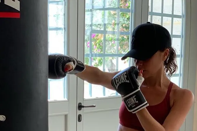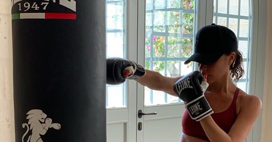 Британская певица, модный дизайнер и бизнесвумен позировала в необычном образе. 45-летняя Виктория Бекхэм отрабатывала боксерские приемы в стильном спортивном look'е.